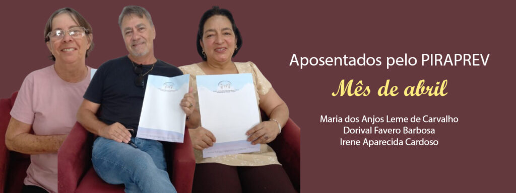 No dia 01 de abril de 2026 foram concedidas aposentadorias aos servidores: Maria dos Anjos Leme de Carvalho, Dorival Favero Barbosa e Irene Aparecida Cardoso. O PIRAPREV agradece todos os anos de serviços prestados ao município de Piracaia e deseja que essa nova fase seja repleta de felicidade!