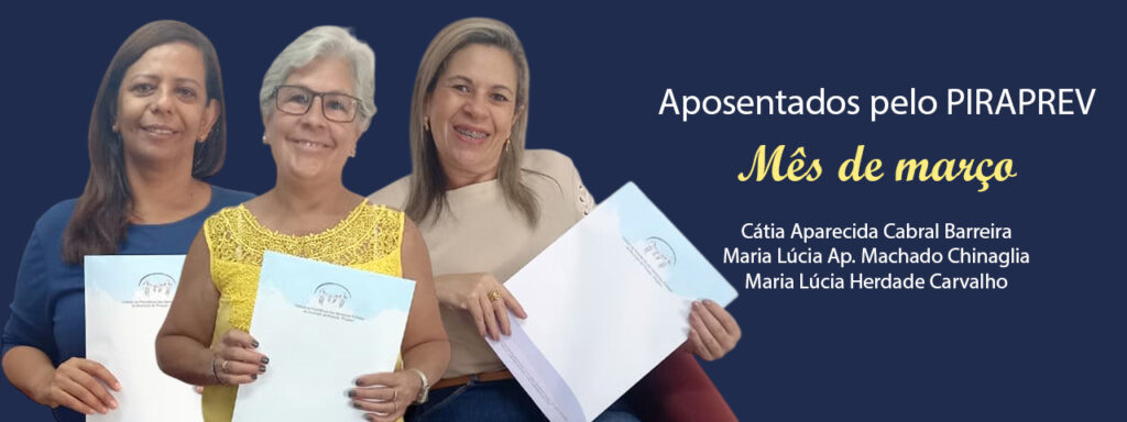 No dia 01 de março de 2026 foram concedidas aposentadorias as servidoras: Cátia Aparecida Cabral Barreira, Maria Lúcia Aparecida Machado Chinaglia e Maria Lúcia Herdade Carvalho. O PIRAPREV agradece todos os anos de serviços prestados ao município de Piracaia e deseja que essa nova fase seja repleta de felicidade!